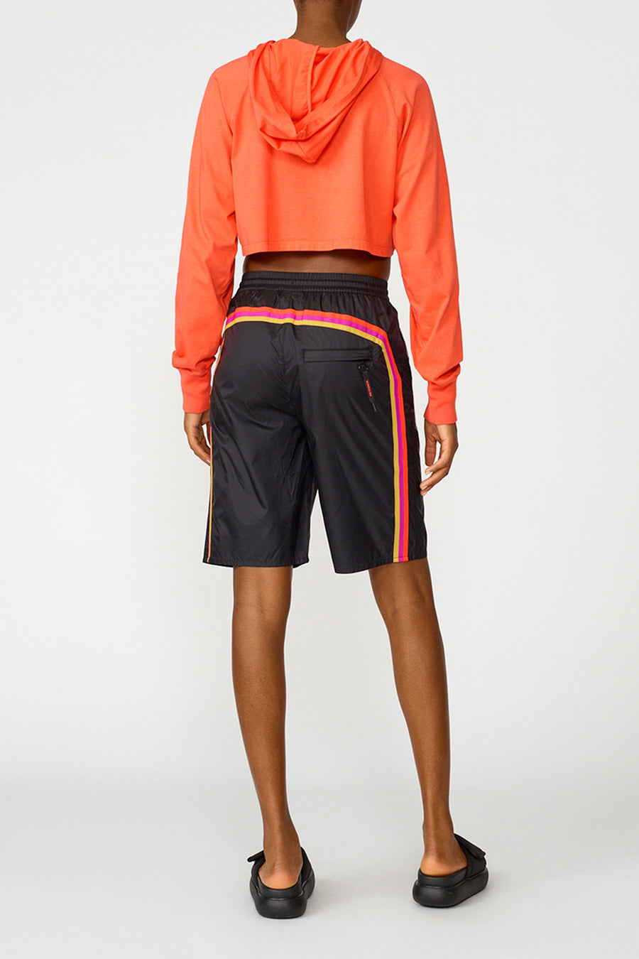 Segui l’arcobaleno, scegli il pantaloncino nero con dettaglio rainbow laterale. Realizzato in materiale glossy ripstop, si adatta alla tua silhouette grazie alla vita elasticata.