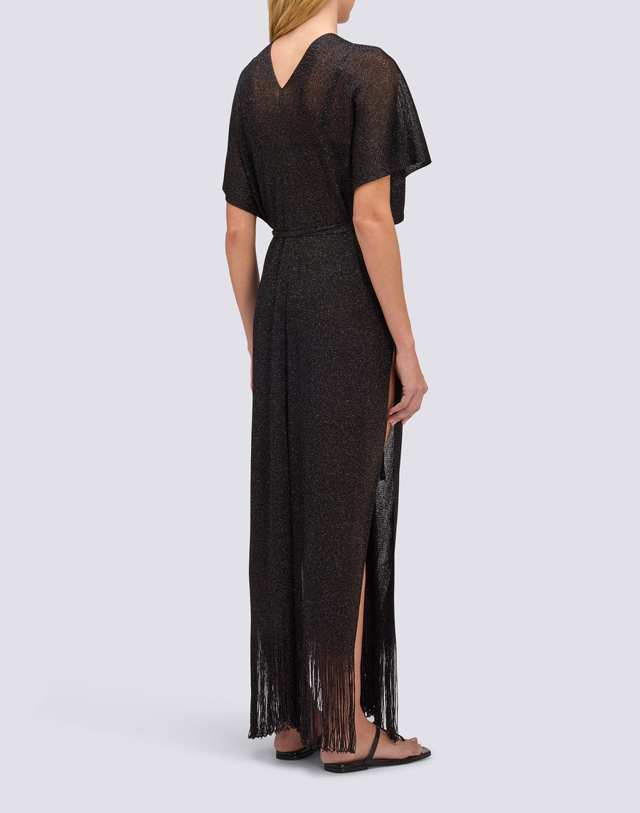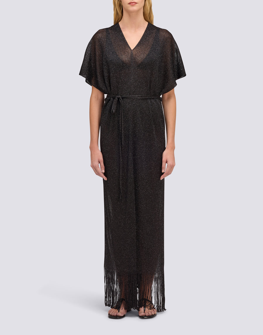 Crea il tuo look estivo con il nostro kaftano lungo con scollo a V. La cintura inclusa e lo spacco laterale conferiscono eleganza e stile, mentre le frange aggiungono un tocco di originalità.
