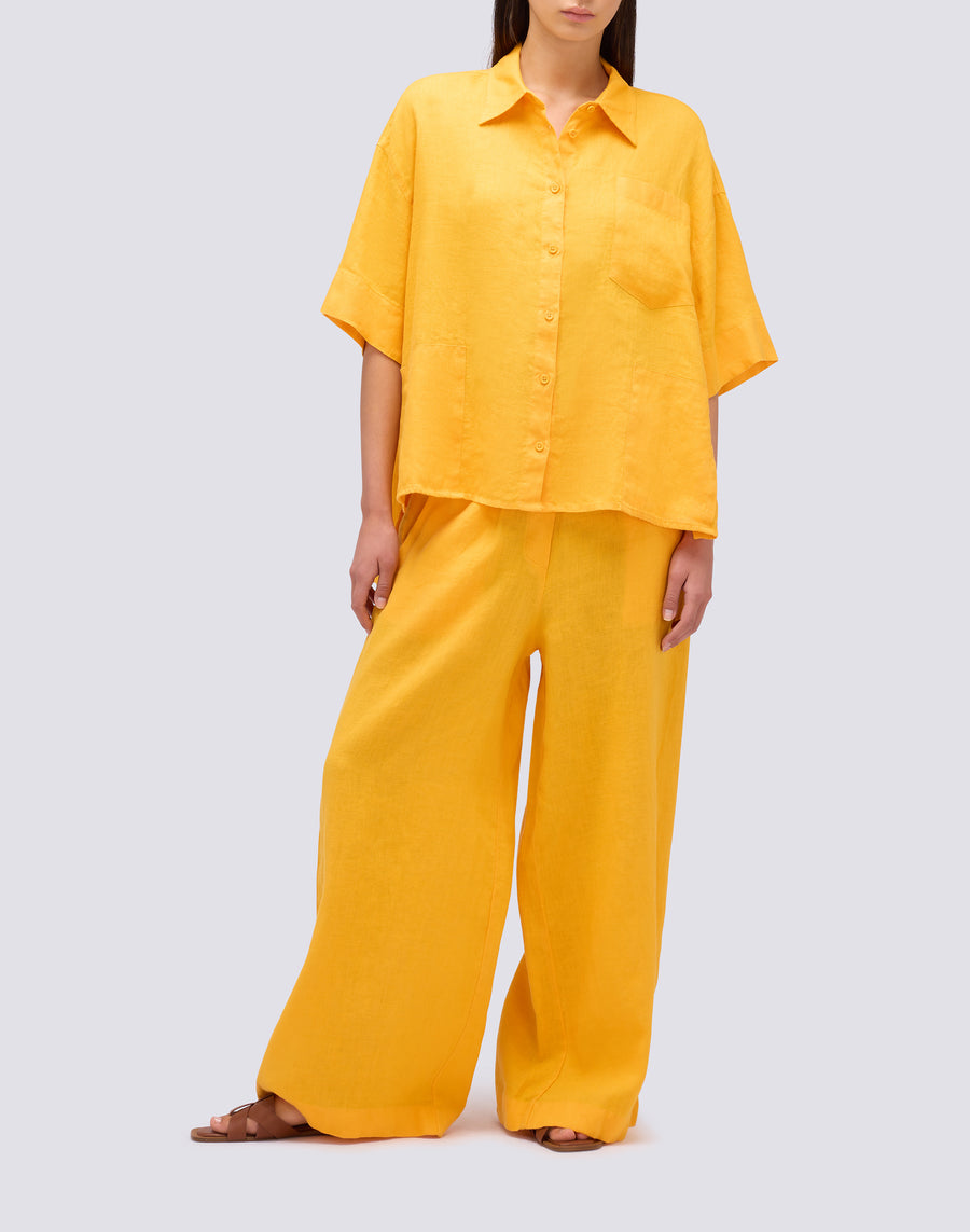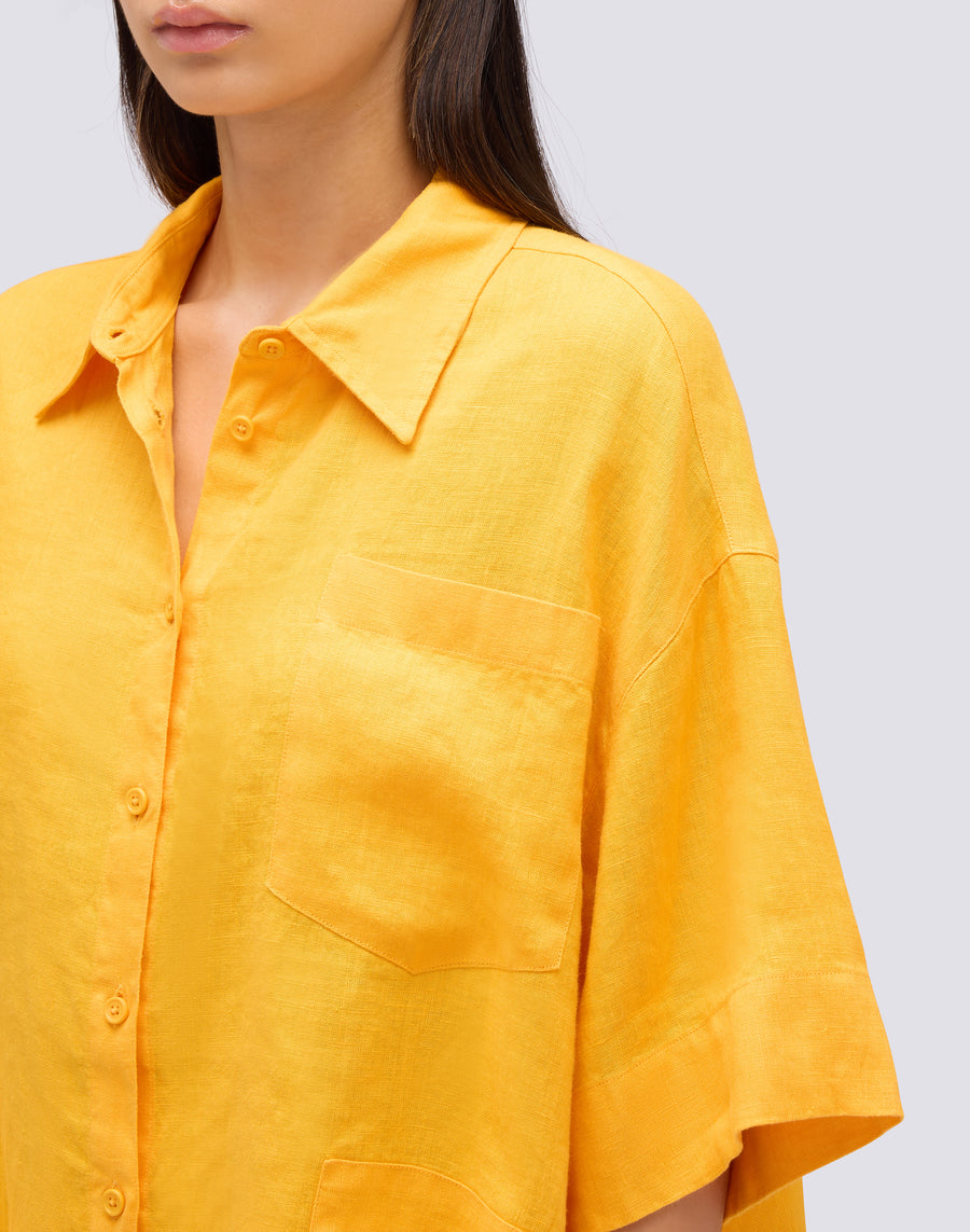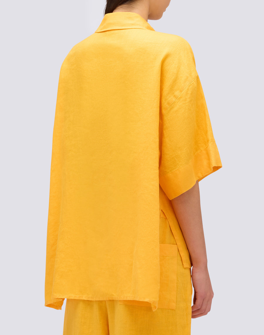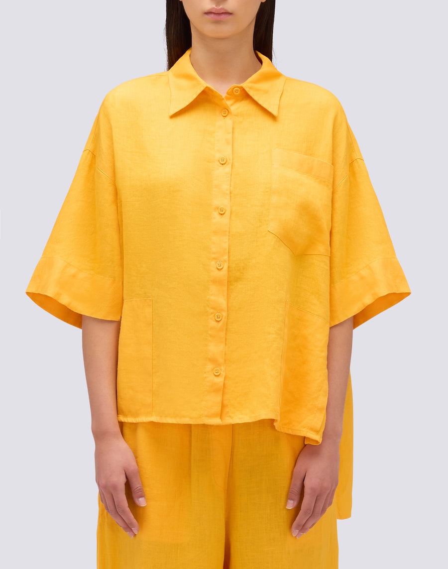 Camicia da donna in lino in tinto capo con tasca frontale. Dal taglio ampio e dalla vestibilità relaxed, è ideale per look estivi freschi e informali.