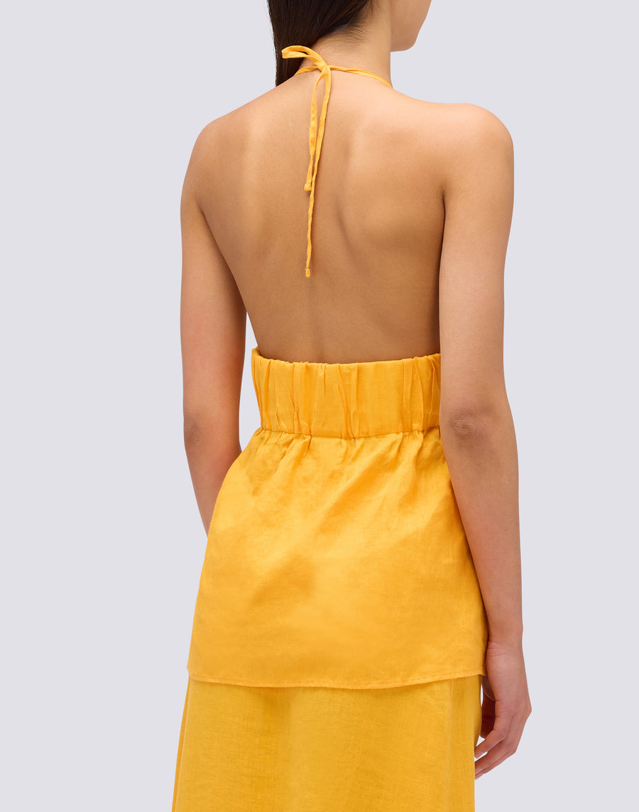 Top smanicato in lino tinto capo con scollatura a V e allacciatura dietro il collo. Ideale se cerchi un capo comodo, fresco, essenziale, ma versatile per i tuoi prossimi look.