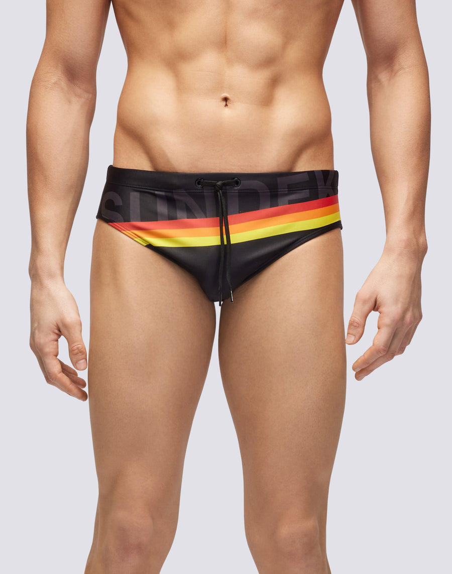 Slip da bagno uomo con stampa tricolor del logo Sundek. Dotato di coulisse e vita elasticizzata, è realizzato in tessuto riciclato. Lunghezza esterno coscia: 3,25”/8 cm (in taglia M).