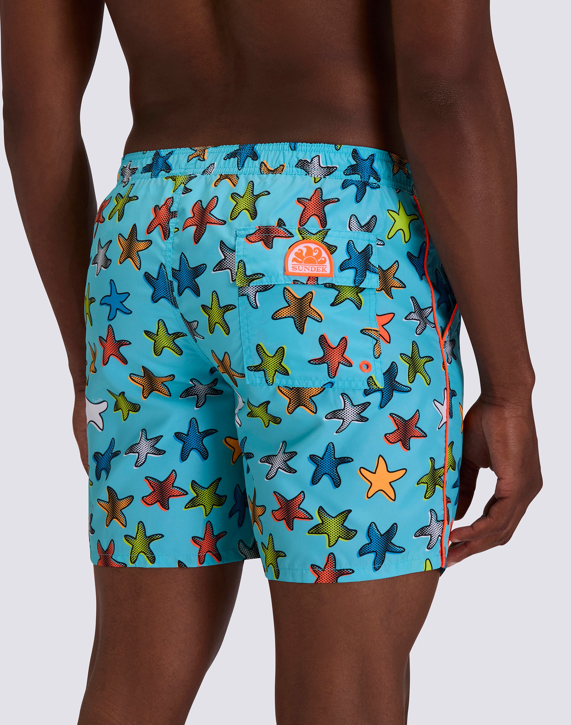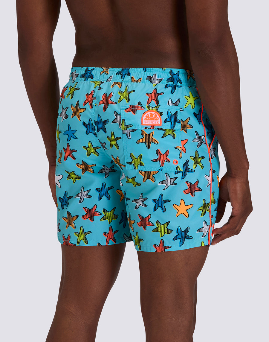 COSTUME DA BAGNO UOMO LUNGHEZZA MEDIA VITA ELASTICATA STAMPA HAPPY STAR IN POLIESTERE RICICLATO REPREVE®