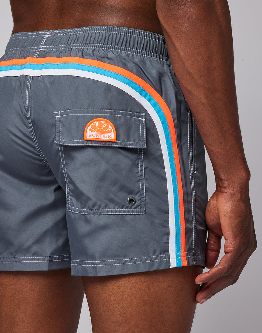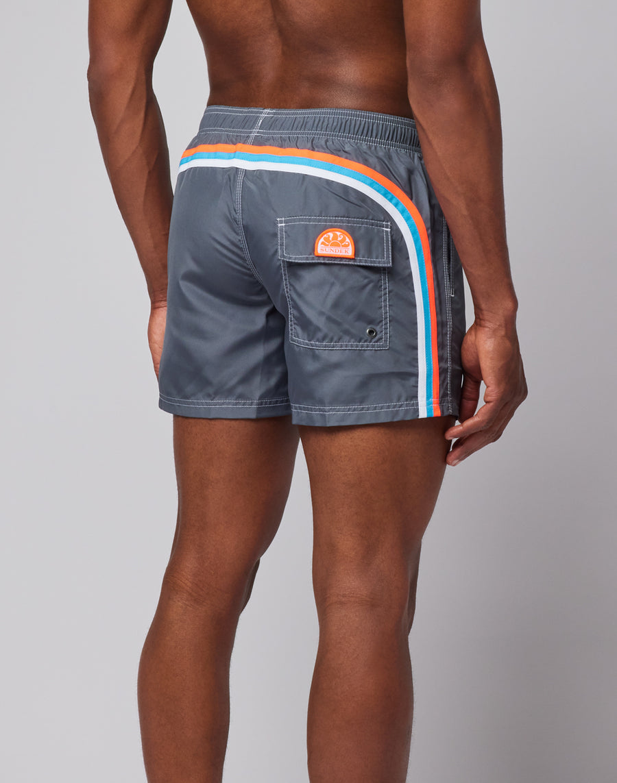 Costume da bagno corto con vita elasticata, realizzato nel nostro iconico tessuto Nylon Taffetà. Dotato di triple cuciture sulle aree di maggior stress, garantisce resistenza e durabilità del tempo. L'iconico arcobaleno caratterizza il back. Lunghezza sull'esterno coscia 14''/35 cm (in taglia M).