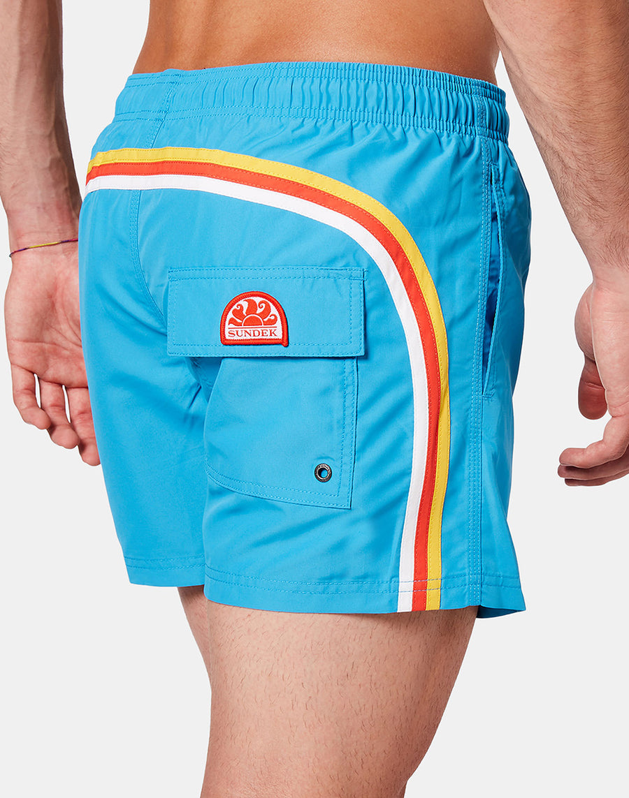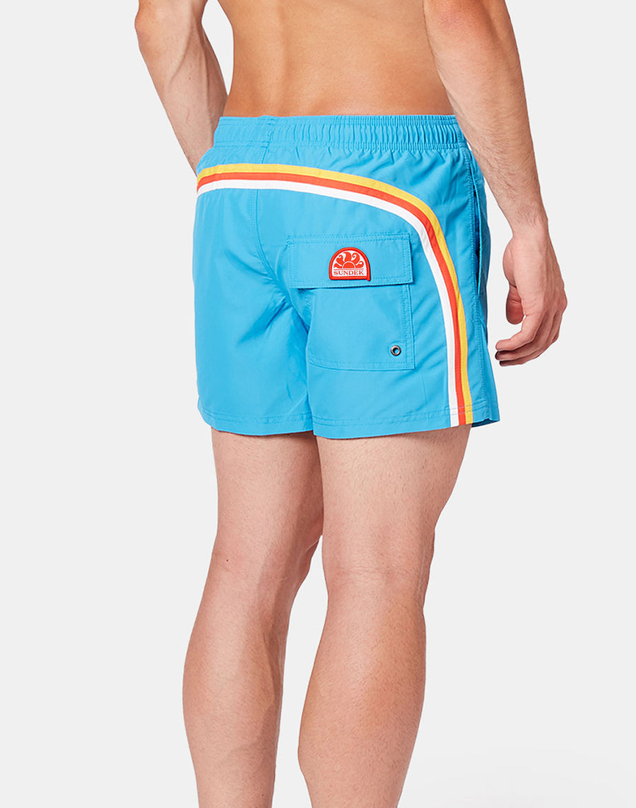 È divertente, brillante e ama l’ambiente: il costume da uomo con arcobaleno in poliestere REPREVE® è realizzato dal riciclo delle bottiglie di plastica. Sostenibilità e performance vanno a braccetto, perché si tratta di un tessuto leggero che si asciuga rapidamente. Inoltre, le cuciture a tre aghi che rifiniscono il modello garantiscono una lunga durata nel tempo. Da mettere subito in valigia.