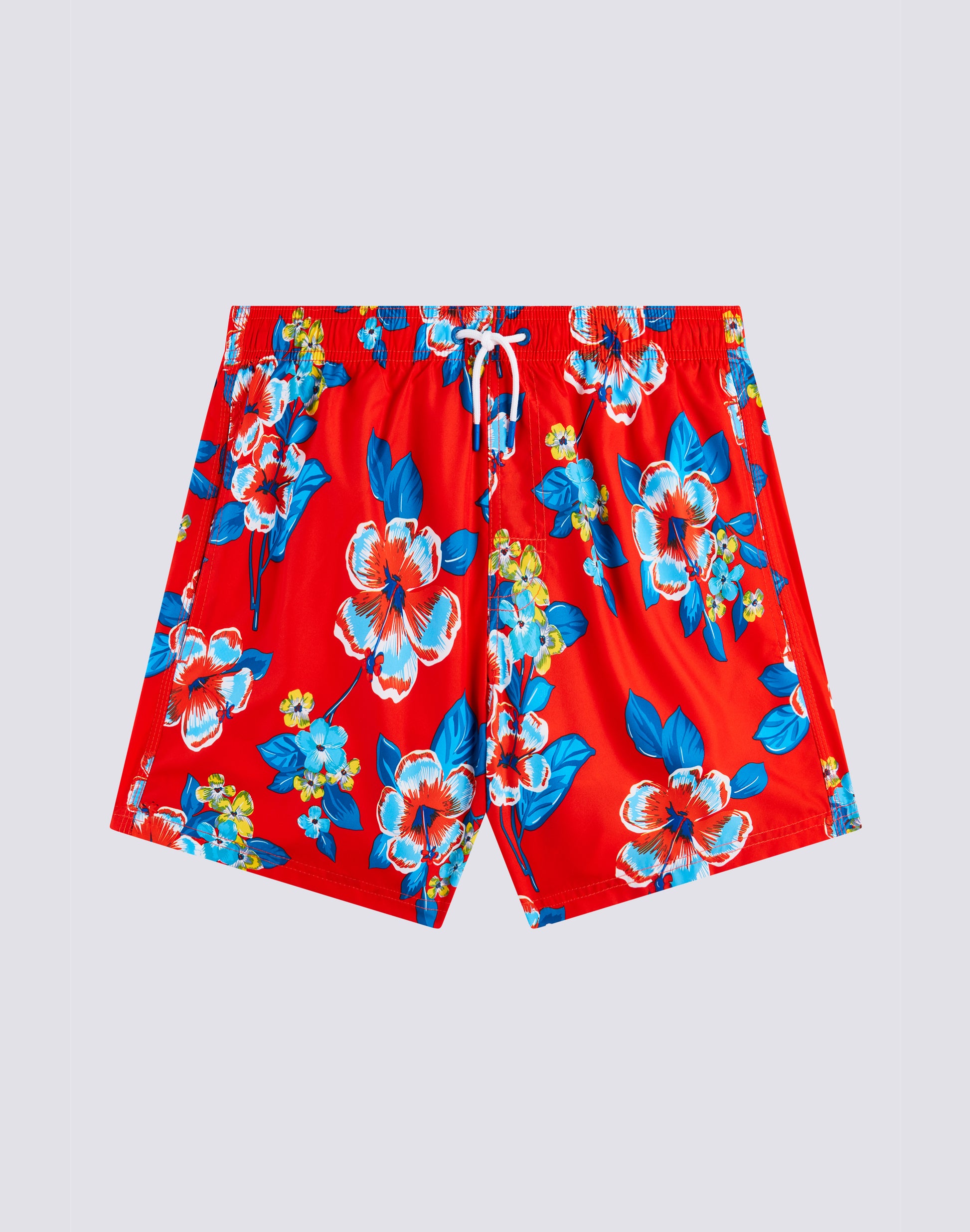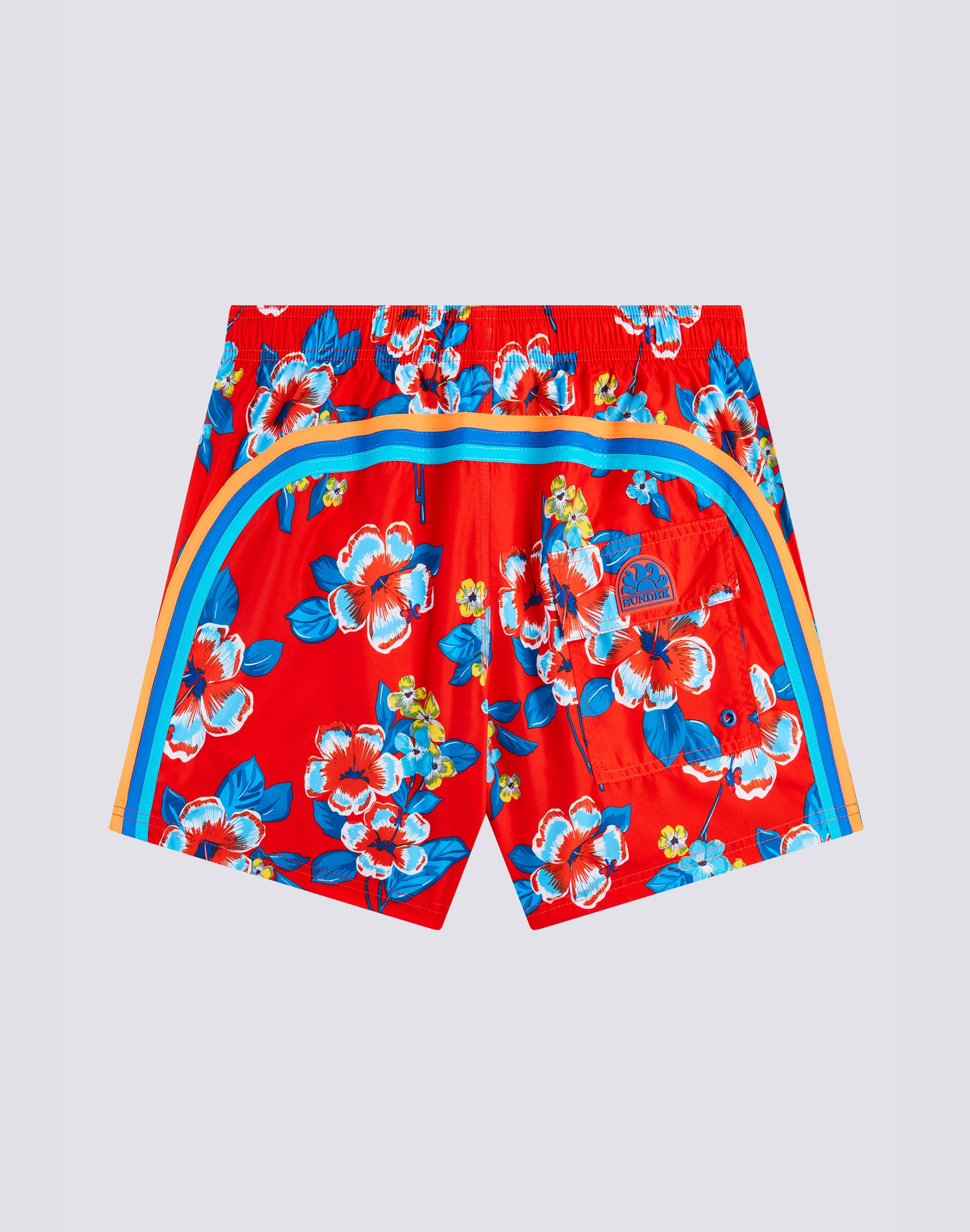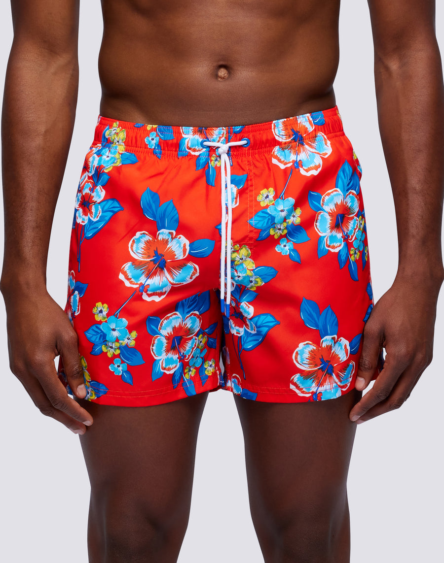 Costume da bagno da uomo con coulisse elasticata in vita, in leggero tessuto repreve® riciclato da bottiglie di plastica. Iconico dettaglio arcobaleno sul retro. Stampa Hibi Pansy. Larghezza esterna 14"/35 cm (taglia m).