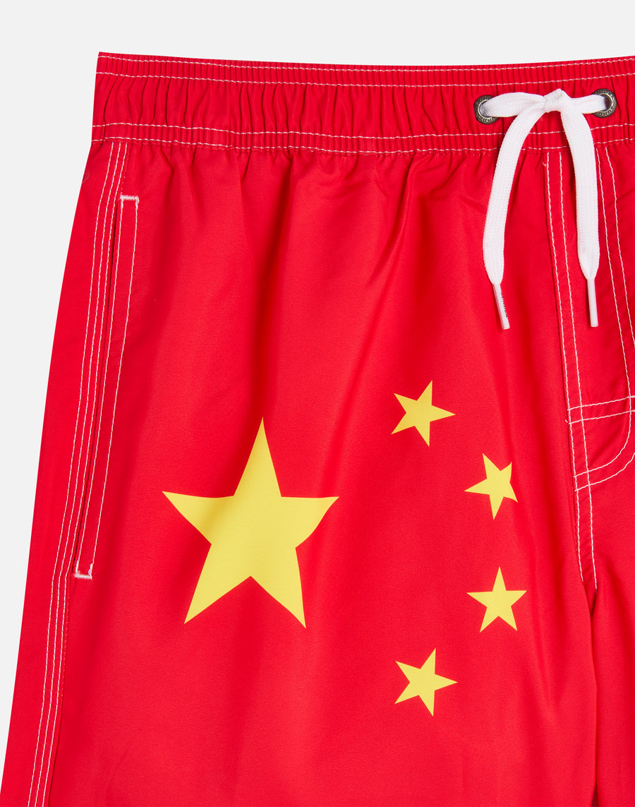 Costume da bagno a pantaloncino da uomo in tessuto riciclato Repreve®, tessuto super leggero dall'asciugatura rapida. Dettaglio iconico arcobaleno Sundek sul back e rappresentazione bandiera della Cina. Lunghezza esterno coscia 14”/35 CM (in taglia M).