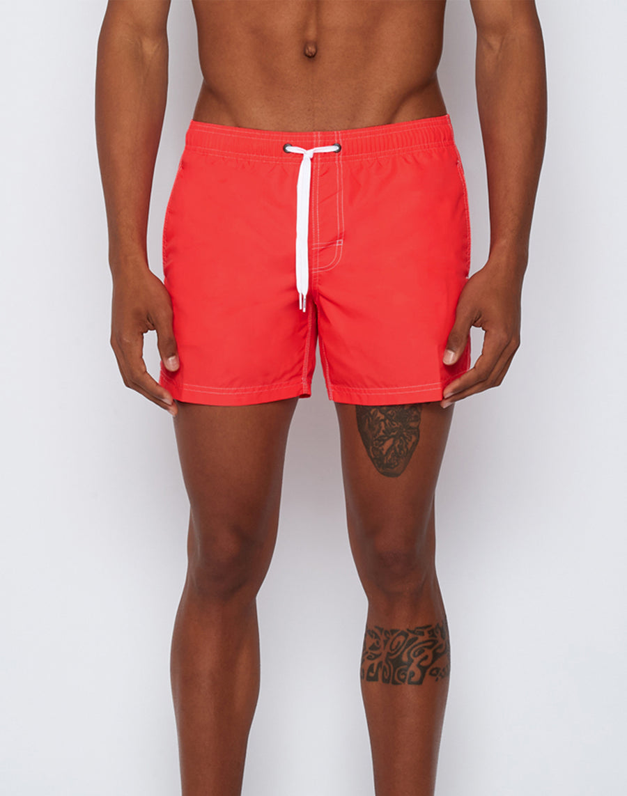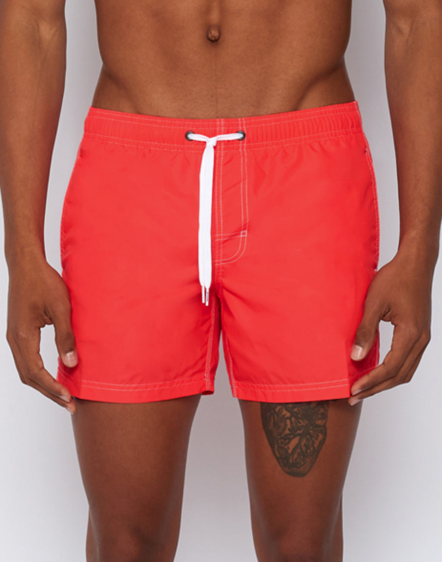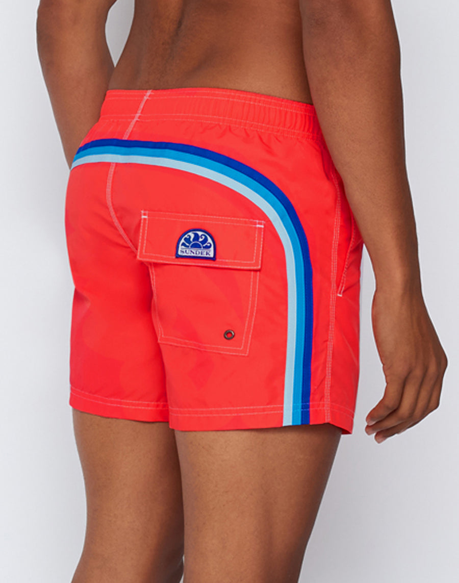 Shorts uomo mare corto e con vita elasticata, coulisse e iconico arcobaleno Sundek sul retro. Questo costume è realizzato con cuciture a tre aghi e al 100% con il nostro tessuto storico, il nylon-taffetà: liscio come la seta, leggero e resistente a tutto, si asciuga velocissimo per darti comodità ovunque, tra le onde e fuori dall'acqua. Lunghezza 35 cm (taglia M), misurati sul lato esterno della gamba.