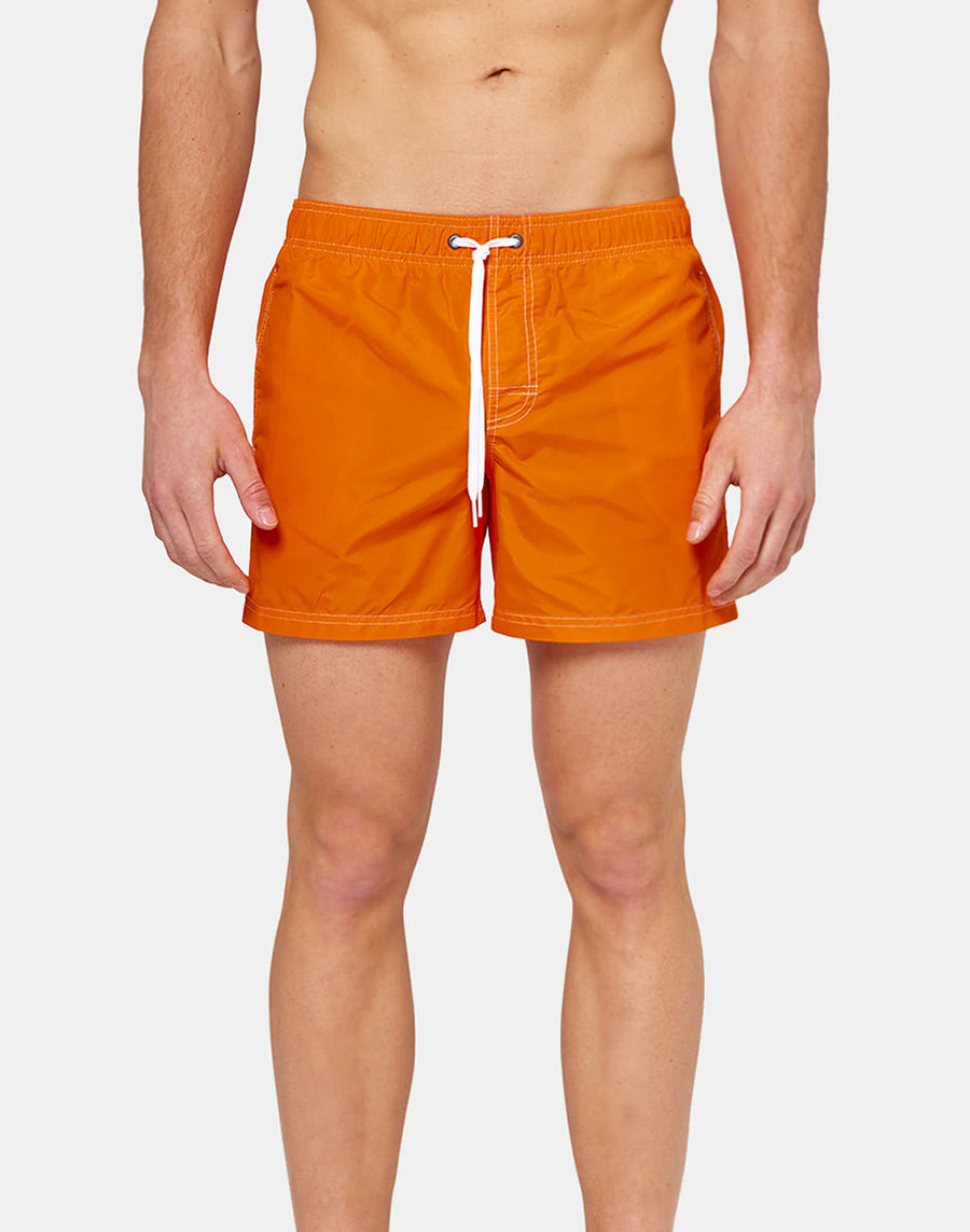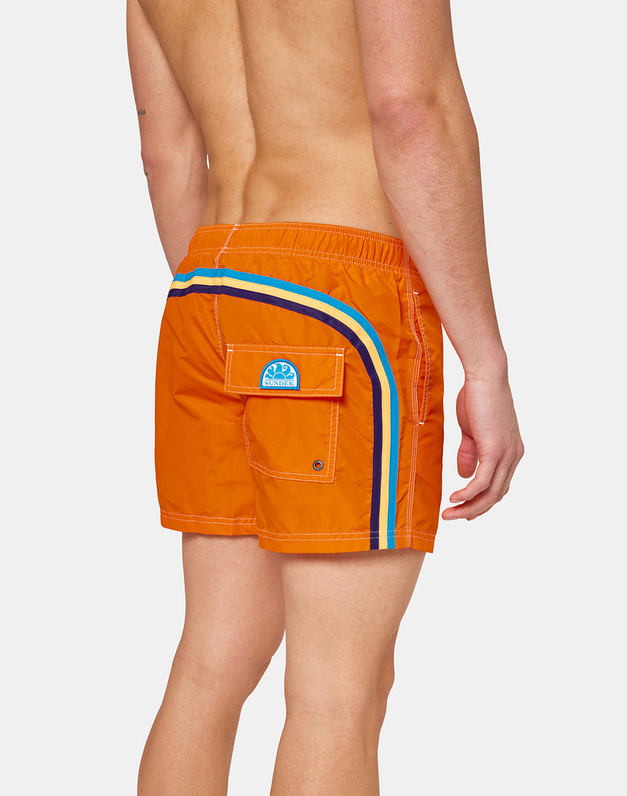 Shorts uomo mare corto e con vita elasticata, coulisse e iconico arcobaleno Sundek sul retro. Questo costume è realizzato con cuciture a tre aghi e al 100% con il nostro tessuto storico, il nylon-taffetà: liscio come la seta, leggero e resistente a tutto, si asciuga velocissimo per darti comodità ovunque, tra le onde e fuori dall'acqua.