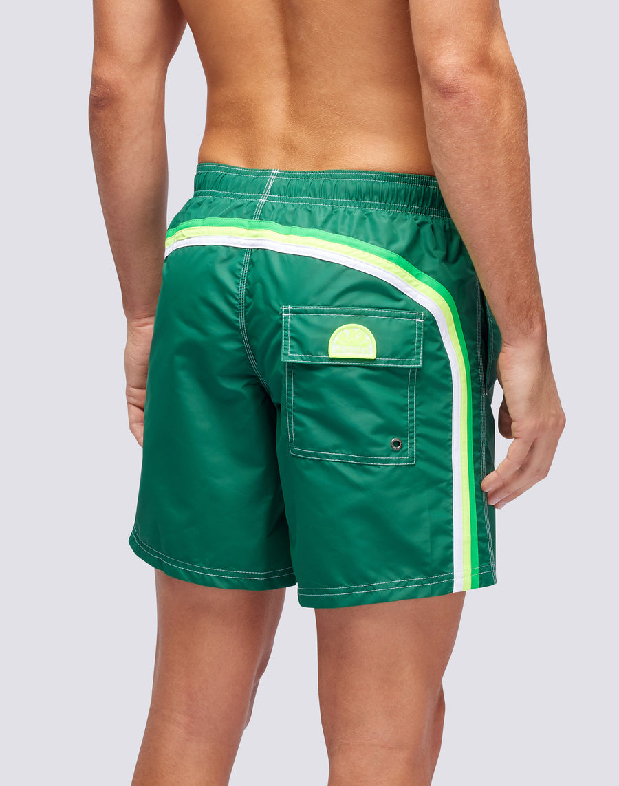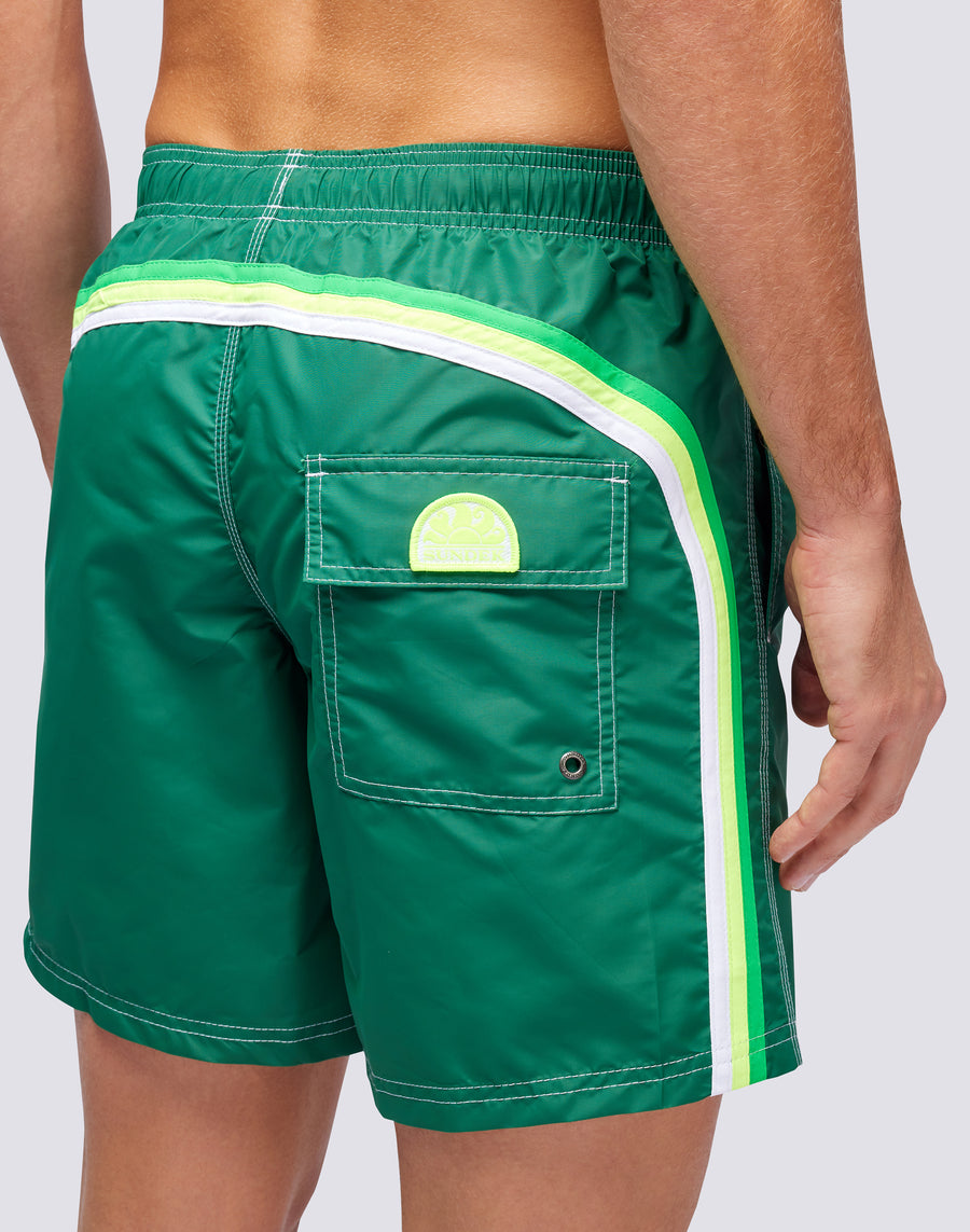 Tutto lo stile senza tempo Sundek in questo boardshort di lunghezza media e con vita elasticata. Elegante, confortevole, destinato a durare vacanza dopo vacanza: è il nostro boardshort classico con coulisse in vita e arcobaleno a contrasto sul retro, realizzato nel nostro storico tessuto nylon taffetà leggero e che si asciuga rapidamente, resistente, con cuciture a tre aghi per un rinforzo ulteriore. Lunghezza 41 cm (taglia M), misurati sul lato esterno della gamba.