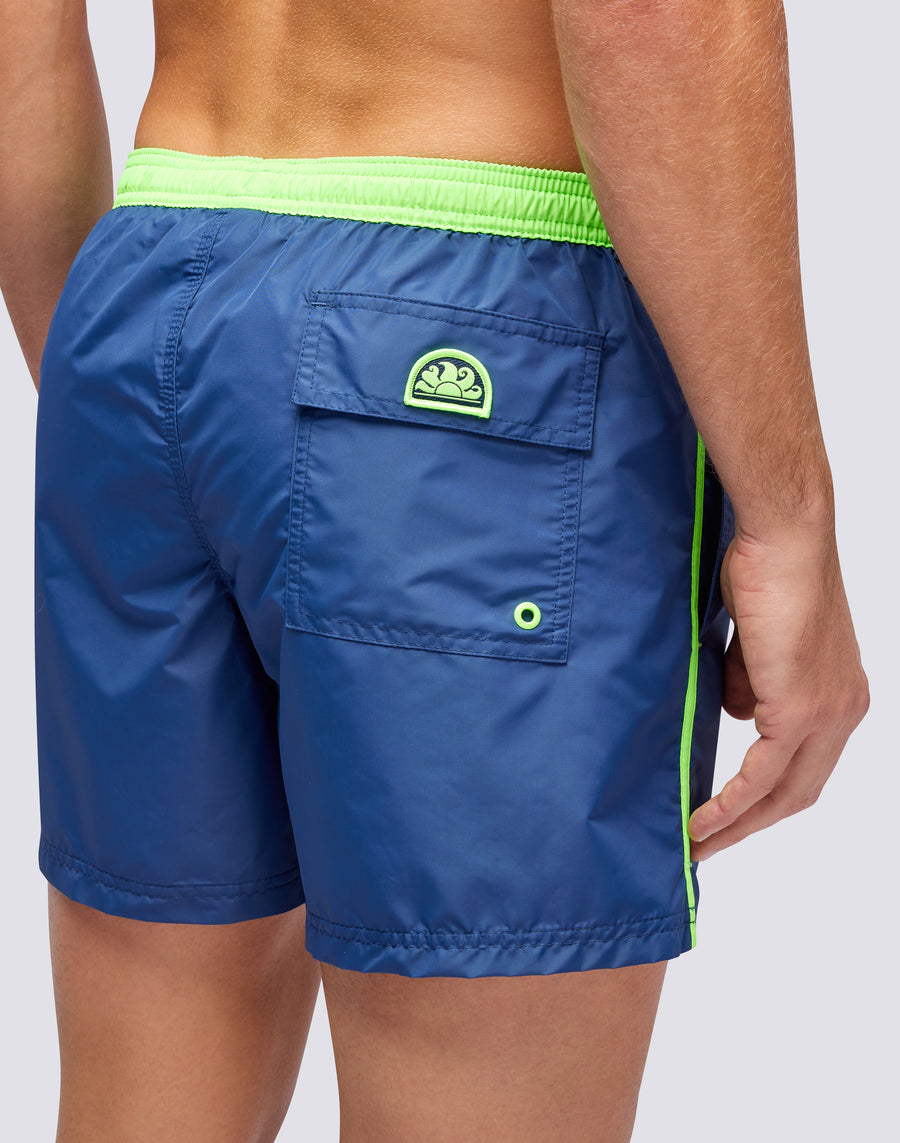 Rinfresca il tuo guardaroba beachwear con questo costume corto a pantaloncino, perfetto per le tue giornate in spiaggia o in piscina. Con il tessuto elasticizzato e il piping a contrasto, questo costume da bagno da uomo garantisce un look iconico durante tutta l'estate.