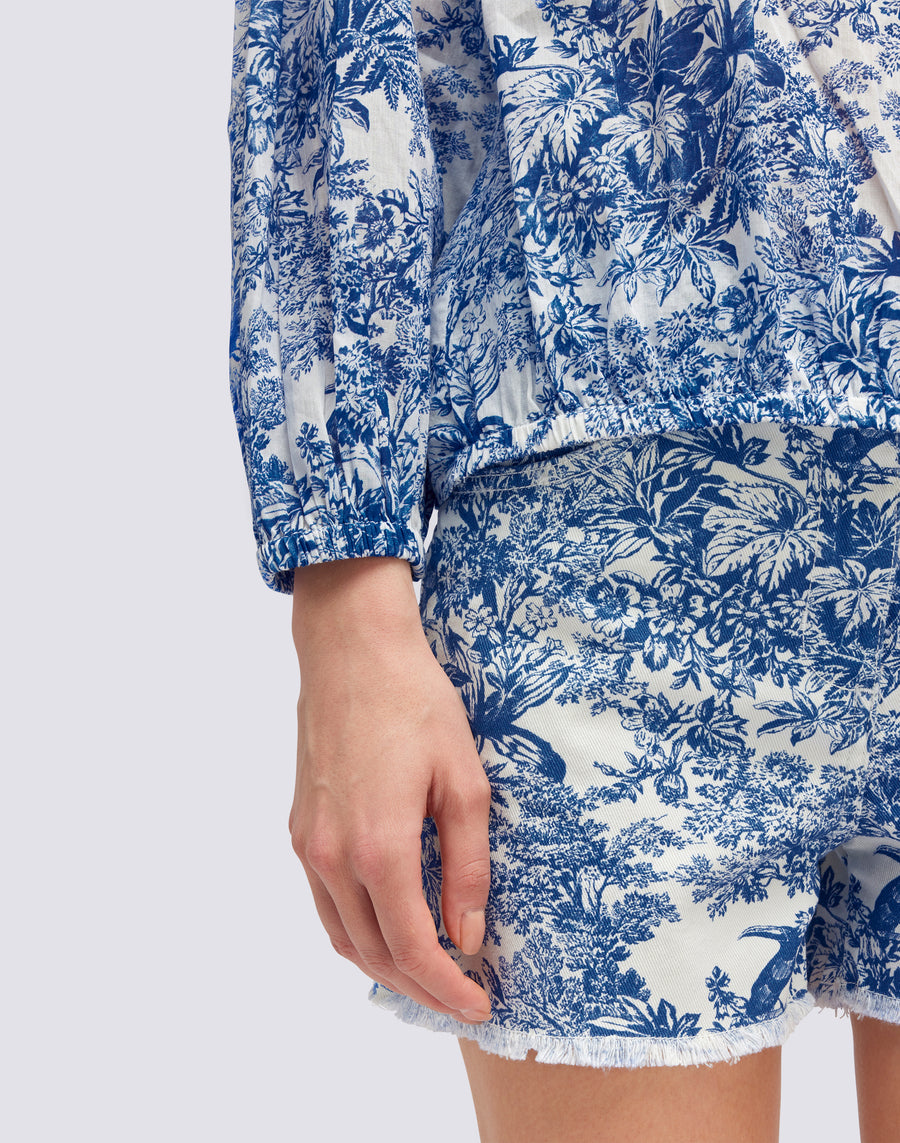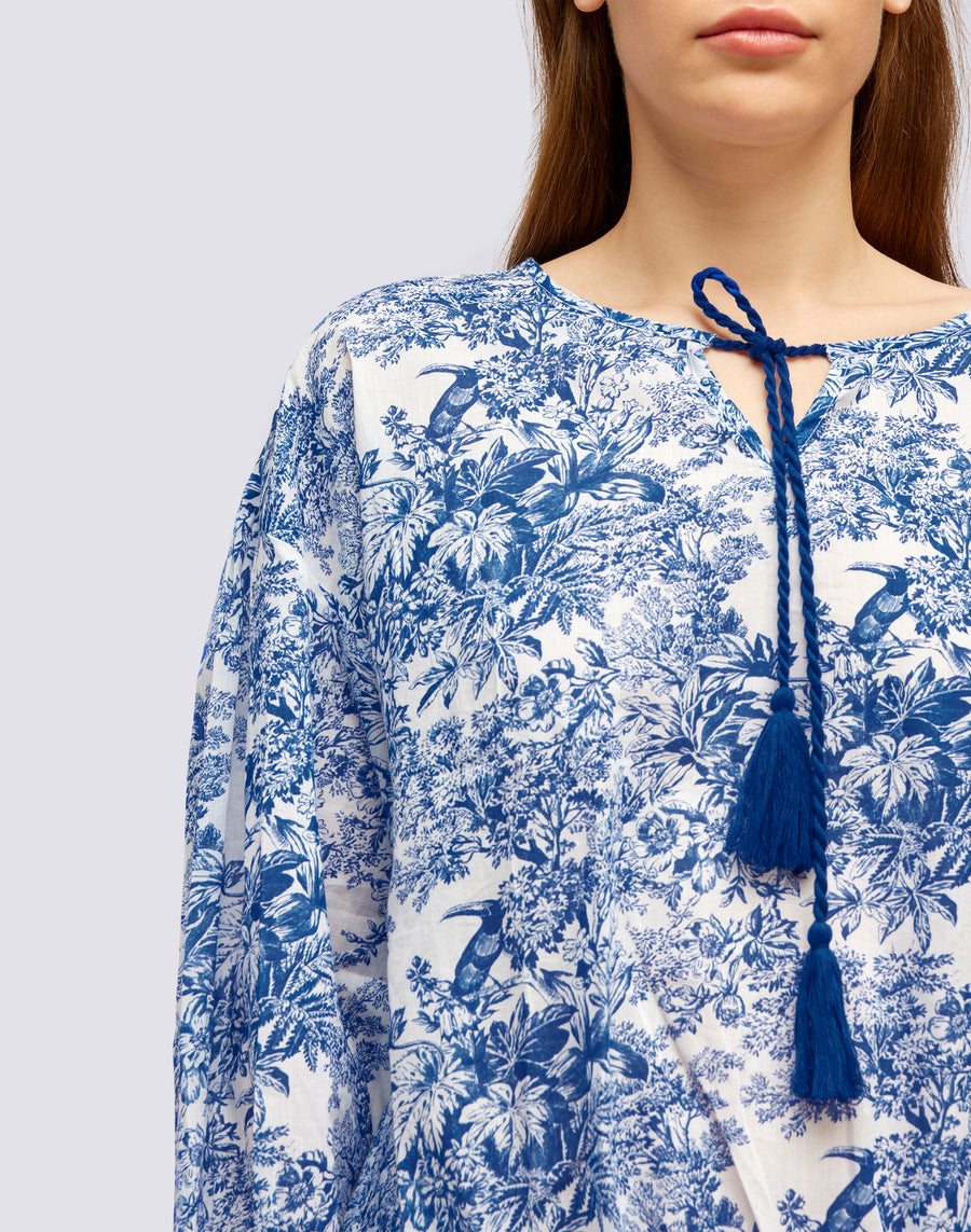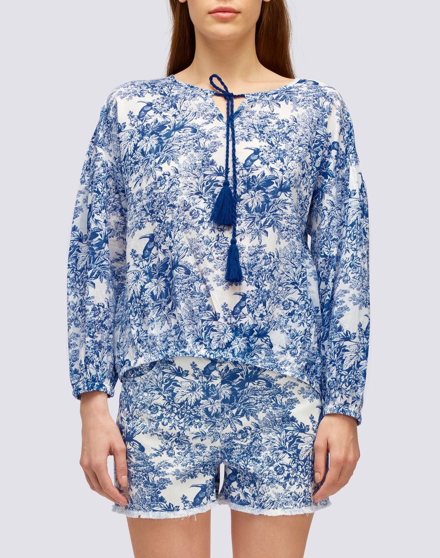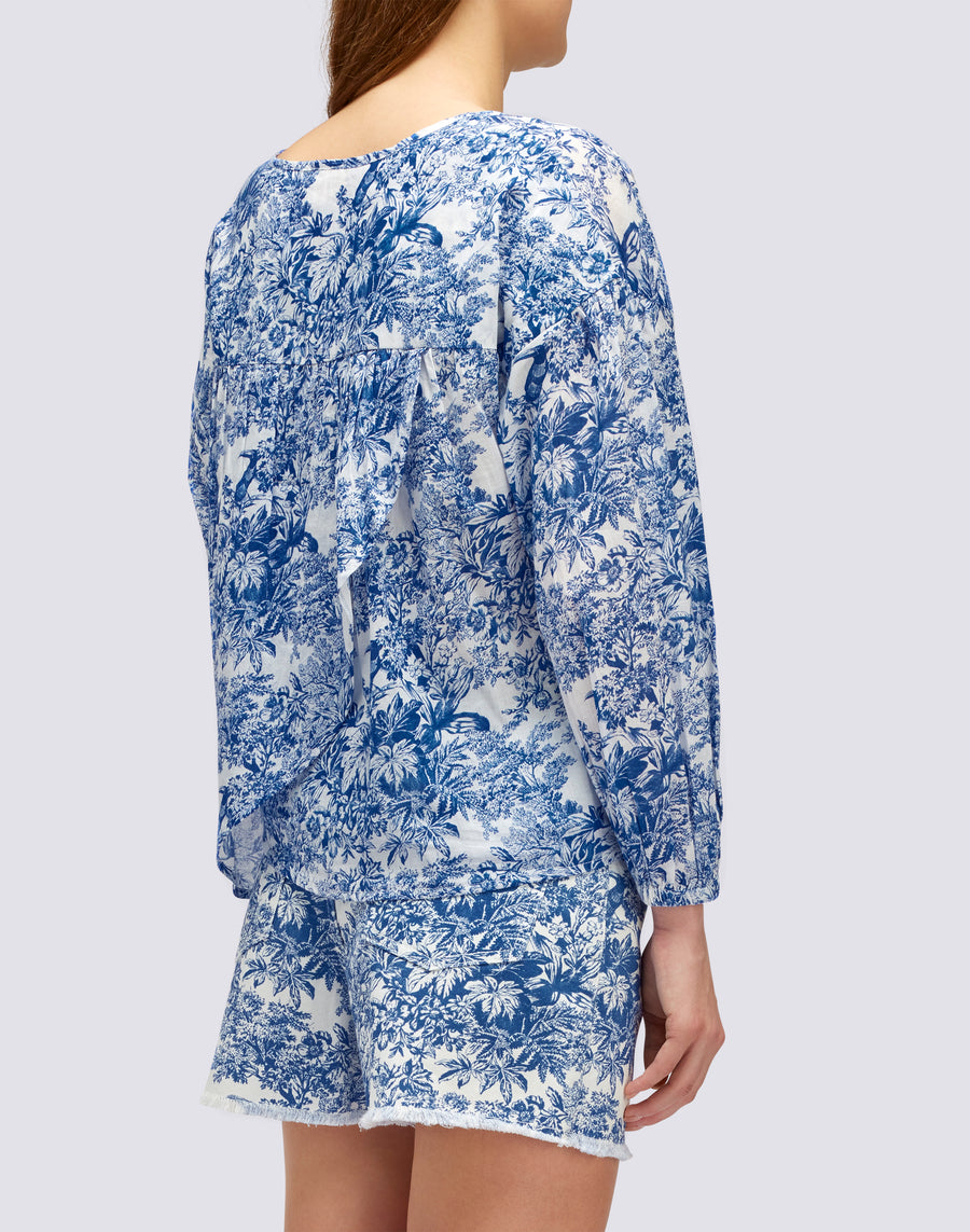 La blusa in stampa Toile De Jouy è caratterizzata da un dettaglio con apertura sul retro e una chiusura al collo con treccia e nappe. Le maniche lunghe con polsini elasticizzati aggiungono un tocco di eleganza a questo capo versatile e confortevole.