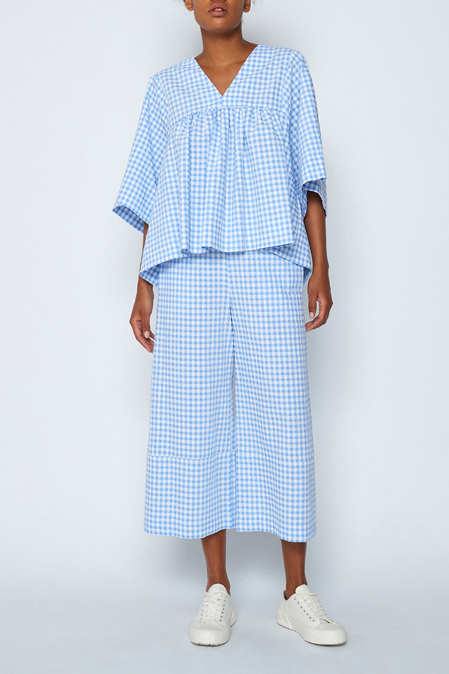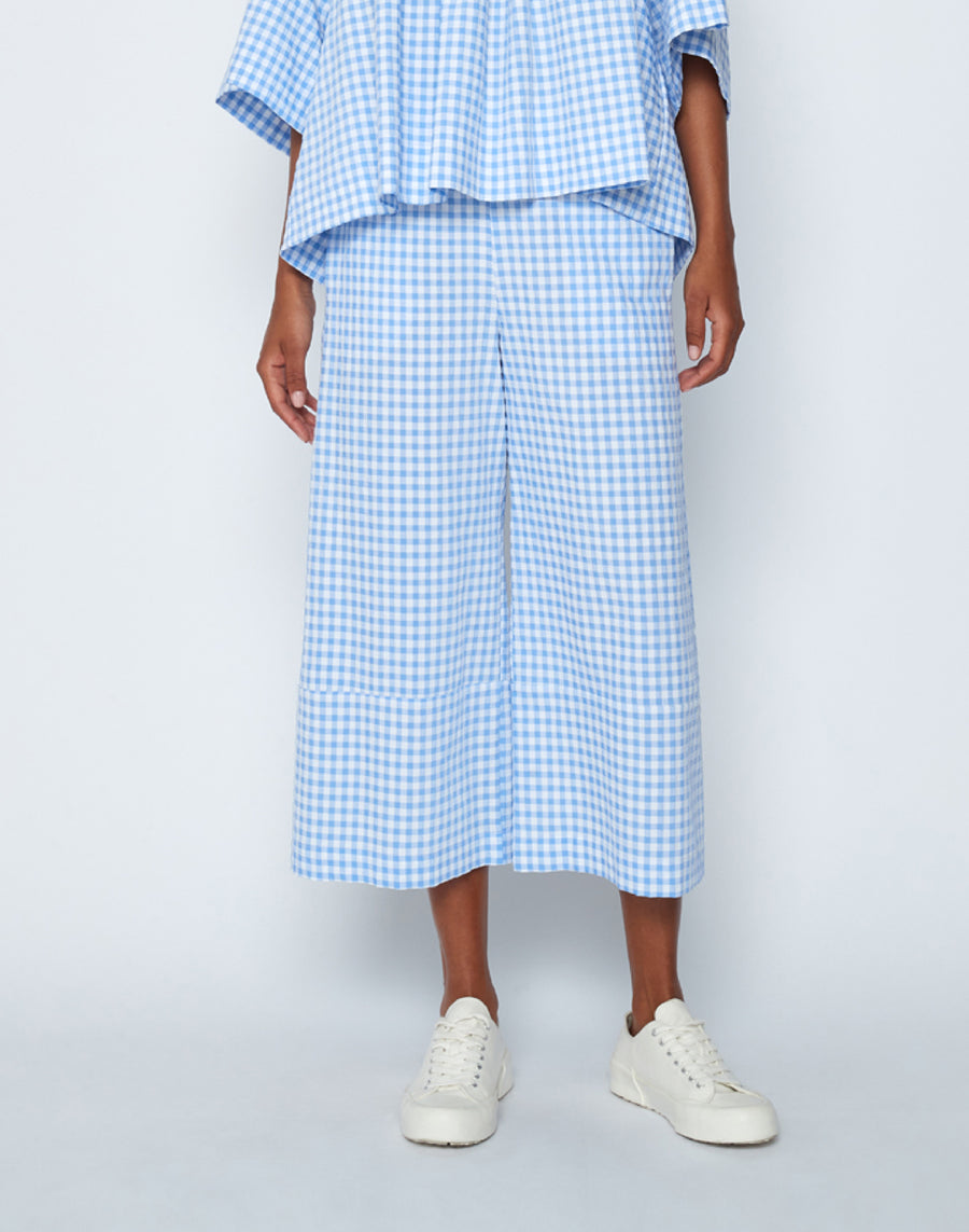 Vestibilità ampia, vita alta, taglio cropped e stampa check per questo pantalone facile da abbinare, da indossare tutta l'estate, perfetto con sneakers e sandali.