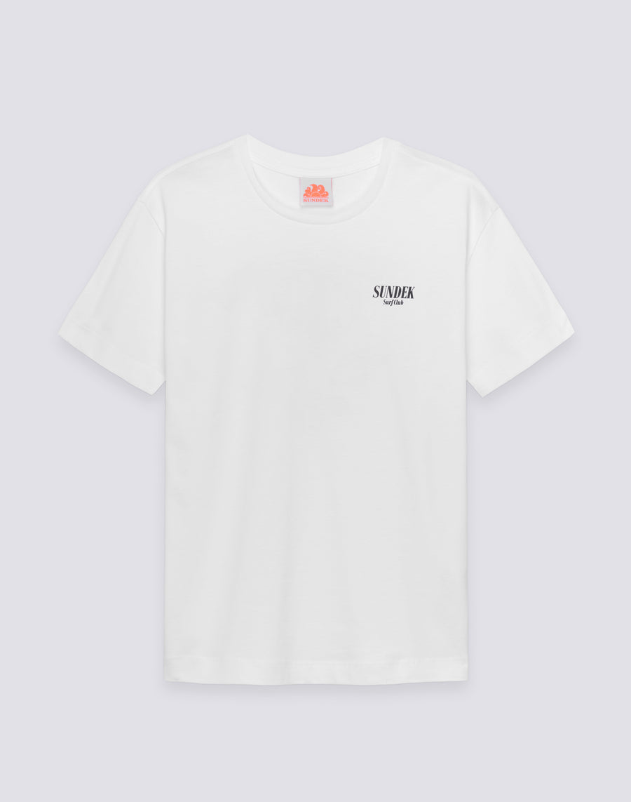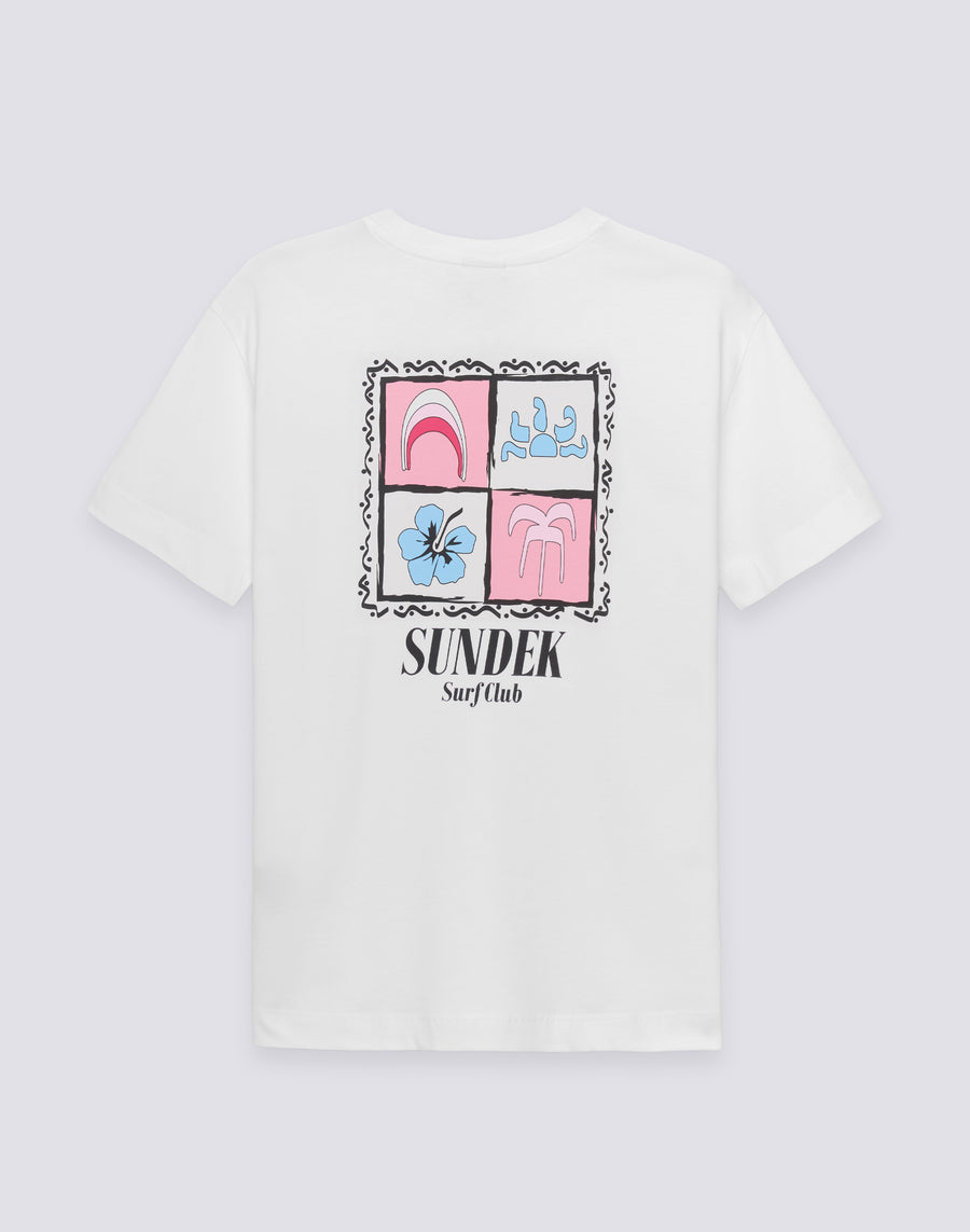 T-shirt donna a girocollo morbido con stampa di elementi iconici sul retro e scritta SUNDEK stampata invece sul fronte. Un capo basic e versatile da usare da solo o abbinato ad altri pezzi della collezione.